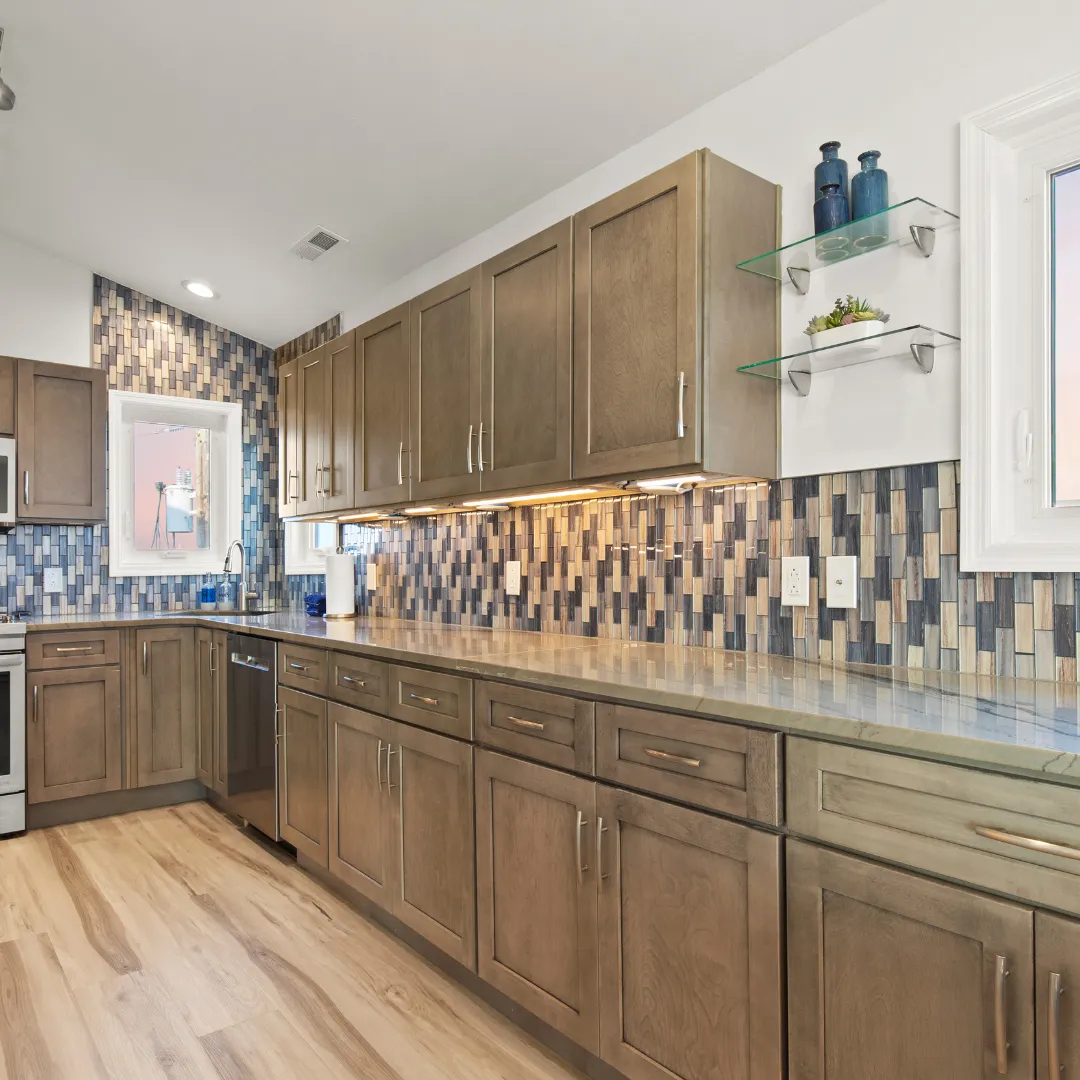 This renovated kitchen has a ton of countertop space, and is fully loaded with every appliance and utensil a chef may need to prepare a gourmet meal or enjoy a meal delivered from a local restaurant.