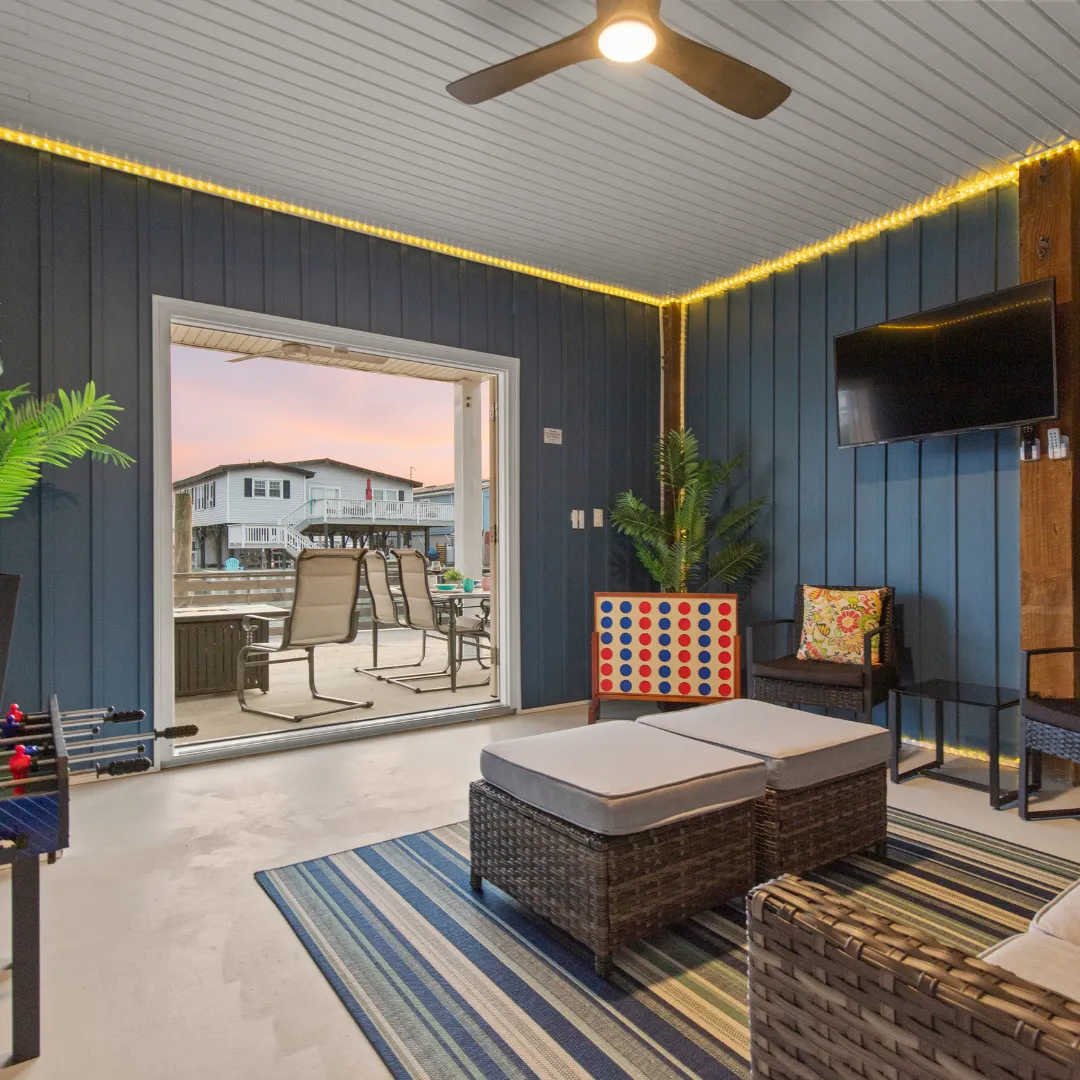 The entertainment room on the ground floor opens up to the fire pit, grill, dining table and dock. This room has a TV to take in the big game as well. Outdoor games feature heavily in this outdoor space.