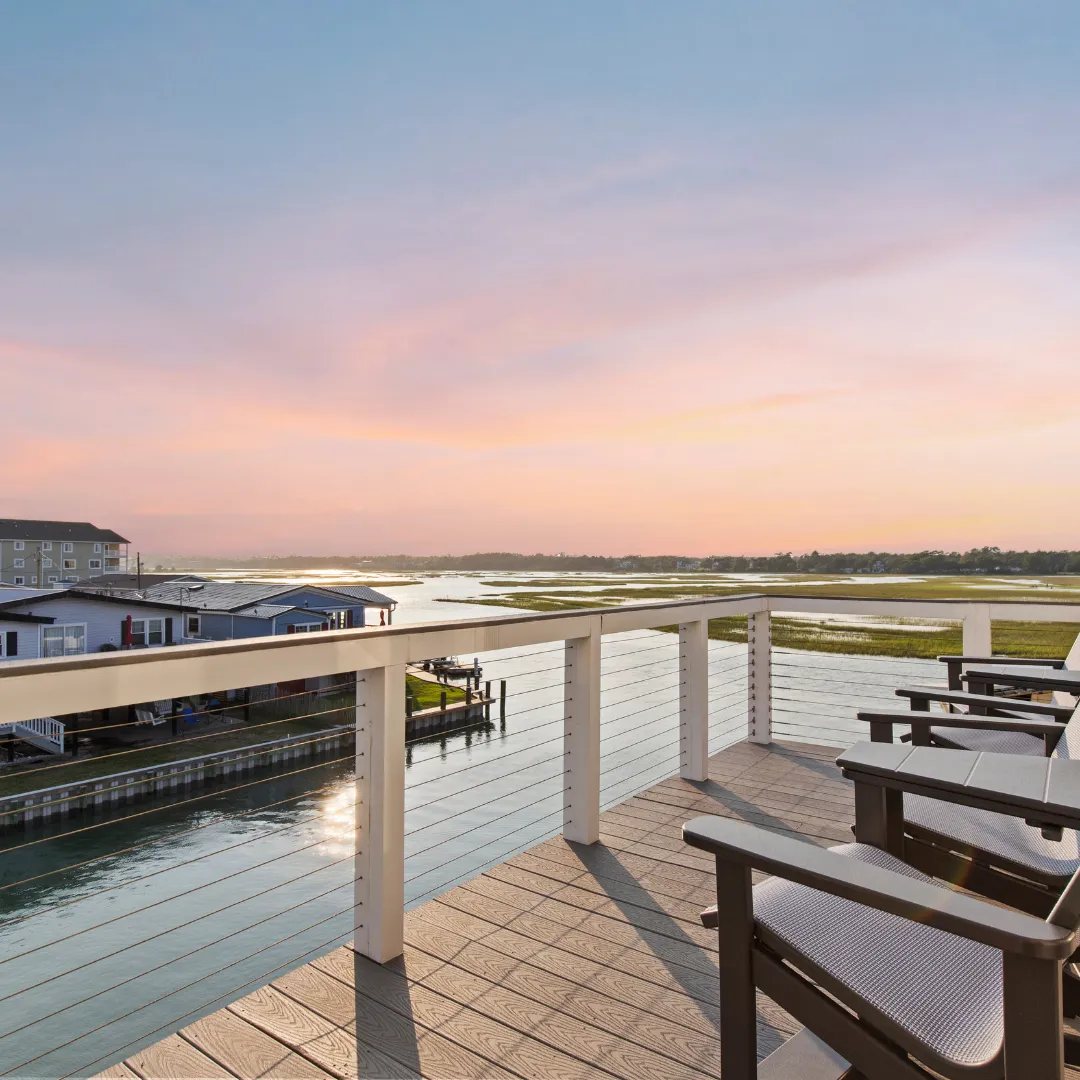 Featuring two massive decks with water views. In the evening the second floor deck sits in the glow of an Instagram neon sign. The third floor deck is split between a screened in portion and high tops that overlook the channel and salt marsh.